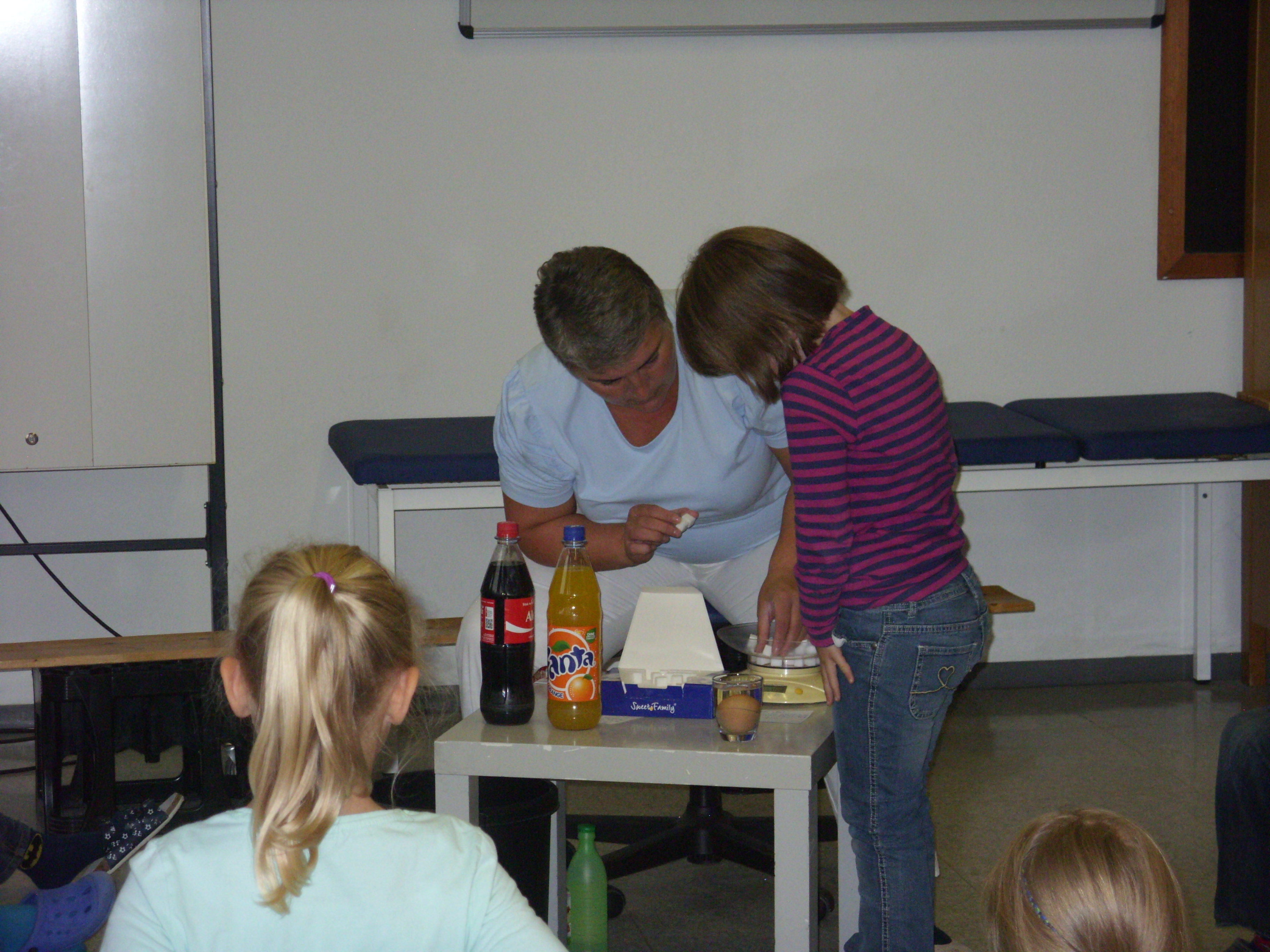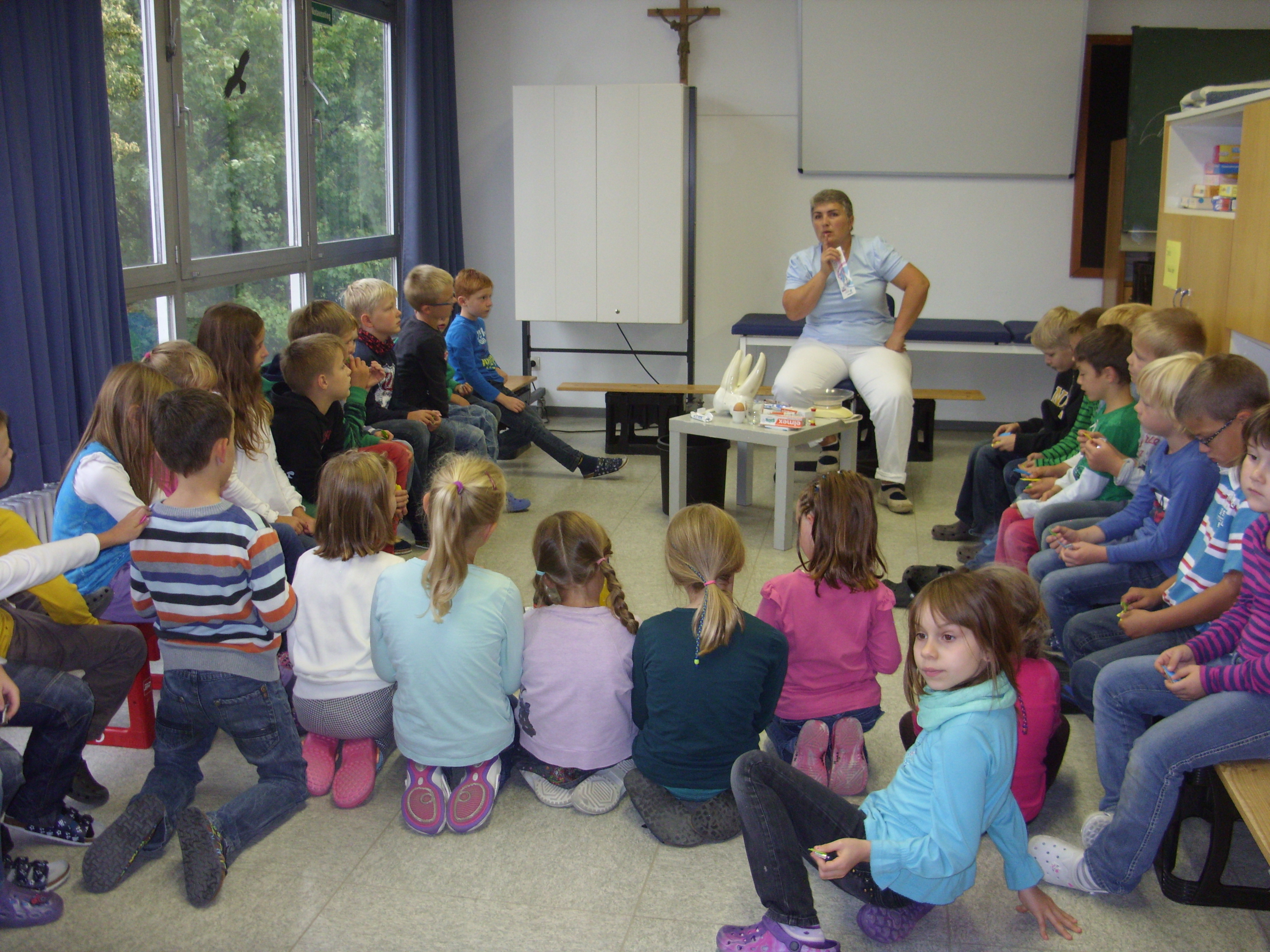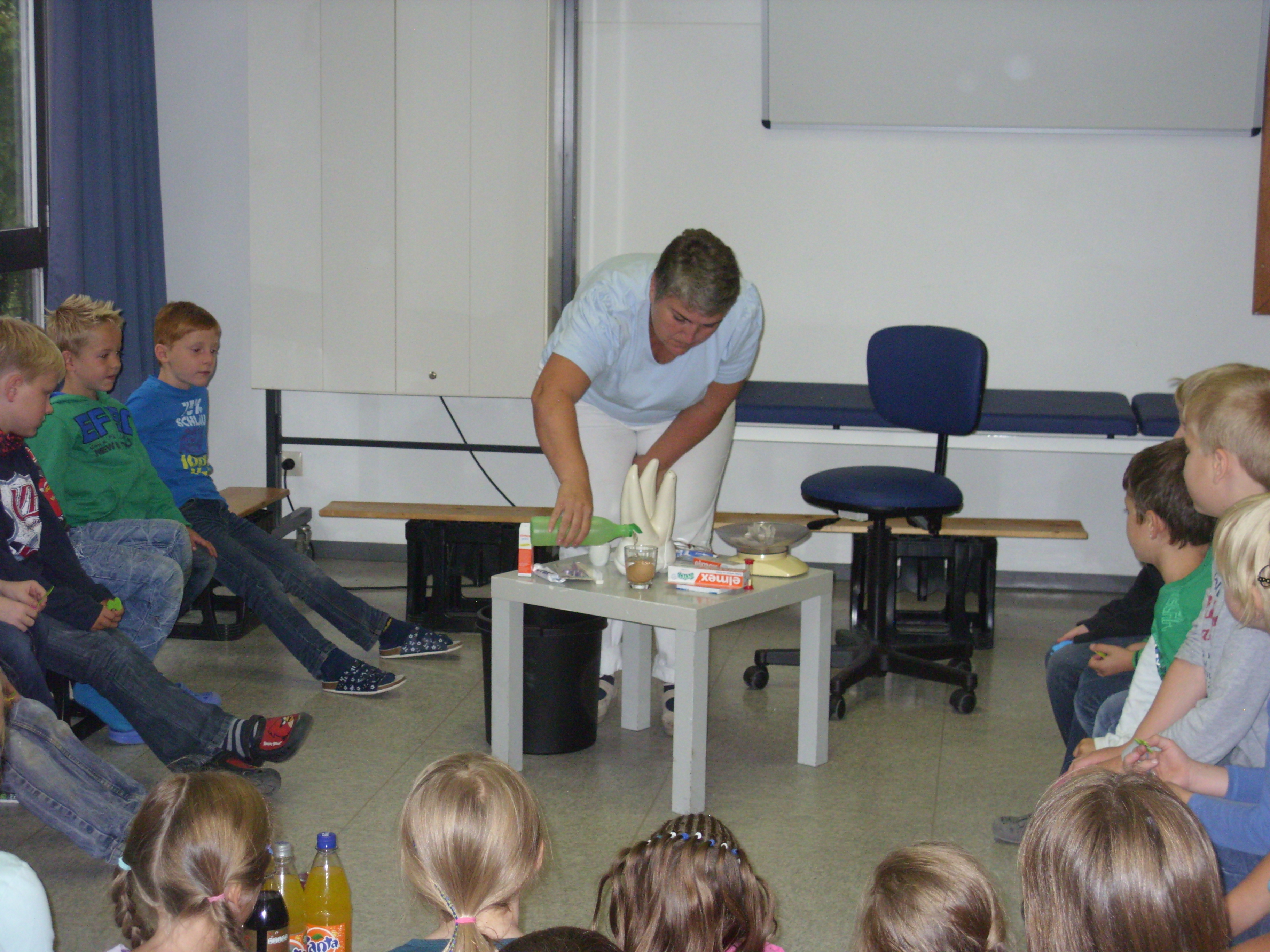 Mit dem Thema „Meine Zähne“ besuchte am 10.09.2013 die Zahnärztin Frau Nerstheimer die Kinder der Klassen 2a und 2b. Sie lernten dabei viel über die Zahnputzmethode KAI, den richtigen Gebrauch von Zahnseide und wie Karies überhaupt entstehen kann. Bei einem sehr anschaulichen Versuch konnten die Kinder sehen, wie die Säure des Essigs die Schale eines Eies angreift, wenn es nicht geschützt ist.