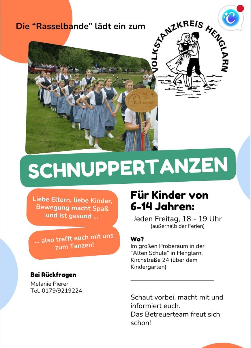 Eingeladen sind Kinder im Alter von 6 bis 14 Jahren, die Freude an Musik, Bewegung und gemeinschaftlichem Tanzen haben. Das Schnuppertanzen findet im großen Proberaum der „Alten Schule“ in Henglarn (Kirchstraße 24, über dem Kindergarten) statt.
