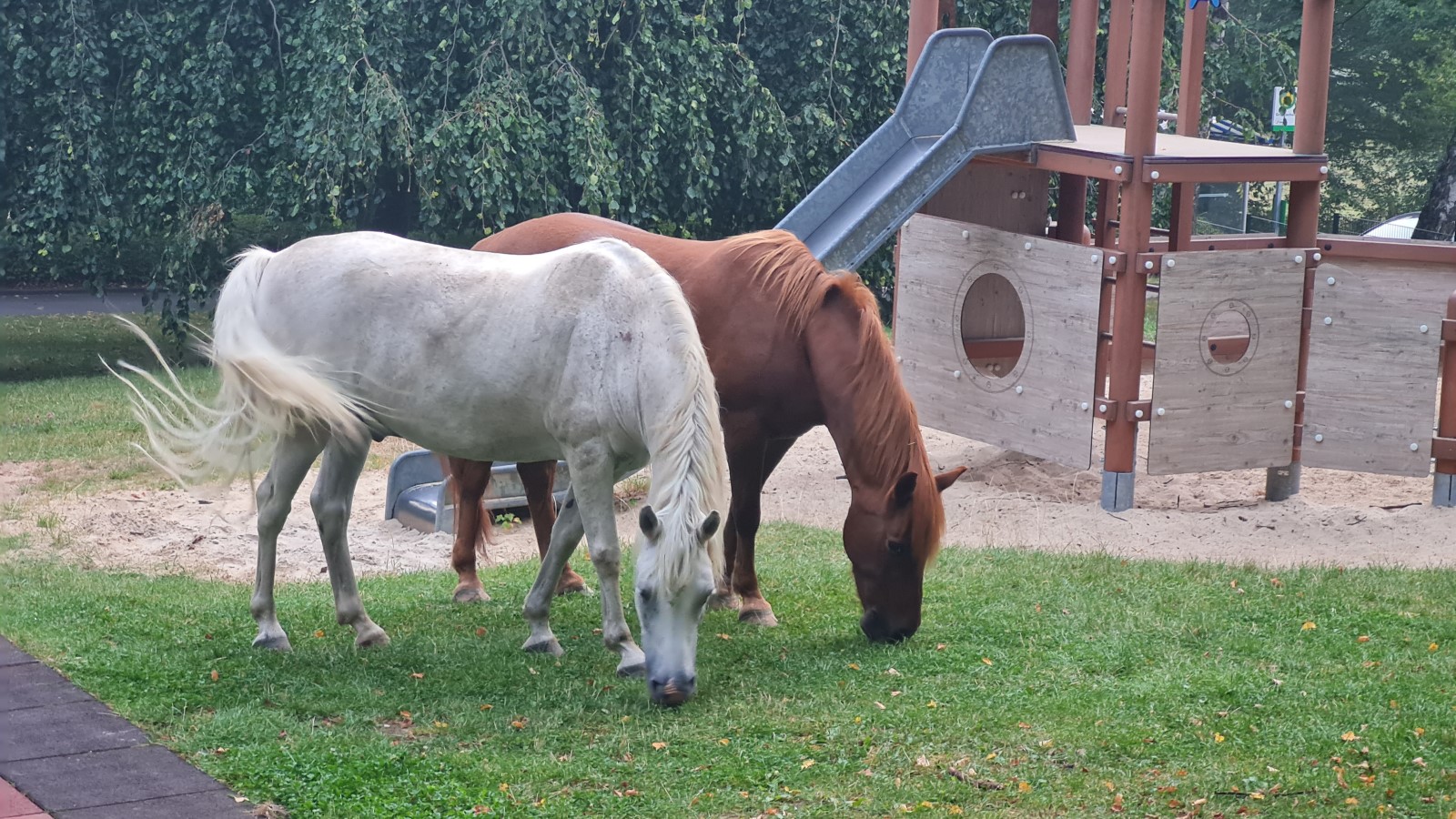 Donnerstag Morgen, 7 Uhr. Nichtsahnend geht Frau Nolte mit ihrer Schultasche vom Parkplatz zum Schulgebäude rüber und schaut dabei über den Schulhof ... da fällt ihr Blick auf die beiden Pferde, die friedlich neben dem Sandsegler grasen.