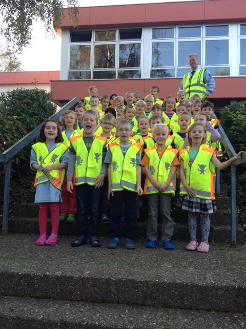 Diese Warnwesten lassen die Kinder, insbesondere in der demnächst beginnenden dunklen Jahreszeit, auf dem Schulweg in der Dämmerung und Dunkelheit für die Autofahrer besser erkennen.