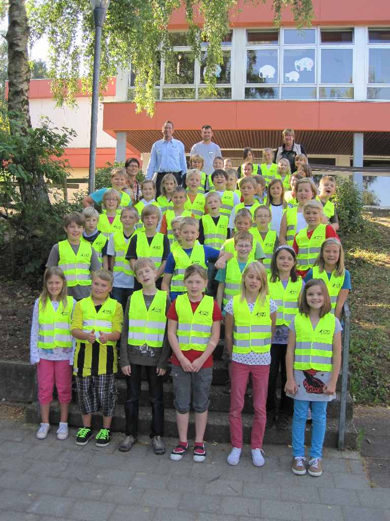 Die Kinder waren sichtlich erfreut über die tollen Geschenke, die sie daraufhin sofort anzogen, um die Leuchtkraft ihrer Errungenschaften schon mal auszuprobieren. „Die neuen Westen werden ganz bestimmt auch bei unserer alljährlichen Radfahrausbildung, die in den vierten Klassen durchgeführt wird, prima gebraucht werden können und gut zum Einsatz kommen!“, waren sich die beiden Klassenlehrerinnen Franzis Salmen und Susanne Stock einig, und sie bedankten sich auch im Namen der Schule für den überaus netten Besuch. Mit den Westen werden zukünftig alle Schülerinnen und Schüler während des Verkehrstrainings im Straßenverkehr jederzeit von allen Verkehrsteilnehmern gut gesehen, die Radfahrausbildung kann somit viel gefahrloser und sicherer ablaufen.