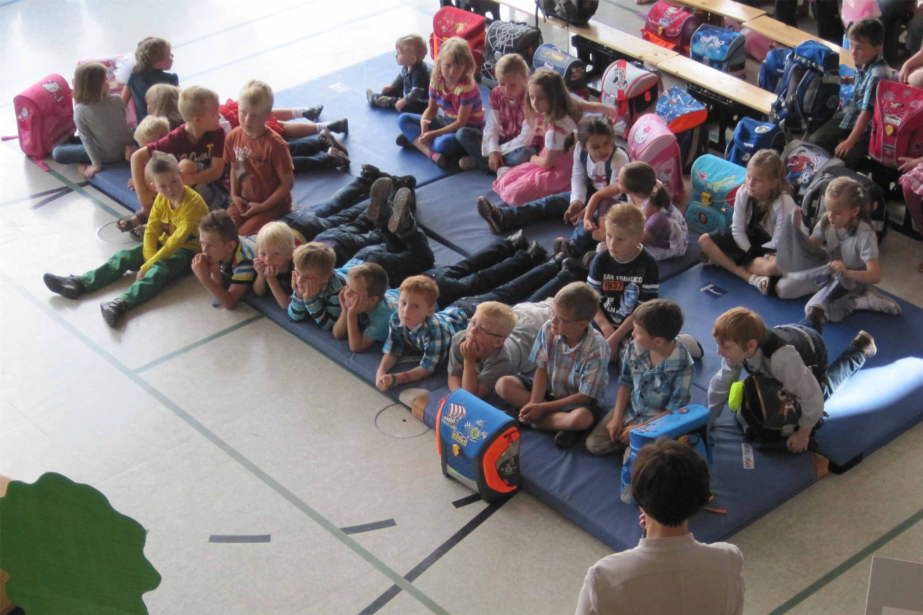 Nachdem die Kinder mit ihren Klassenlehrerinnen A. Meinberg-Nolte (1a) und H. Alhorn (1b) zu ihrer 1. Unterrichtstunde die Turnhalle verlassen hatten, informierte Schulleiterin Frederichs die Eltern noch über einige organisatorische Fragen und lud sie anschließend zu Kaffee und Plätzchen ein, die von Eltern der 2. Schuljahre gespendet und gereicht wurden. So konnten die Eltern in aller Ruhe abwarten, bis die Kinder nach ihrem Unterricht nach dem obligatorischen Fototermin wieder abgeholt werden konnten.