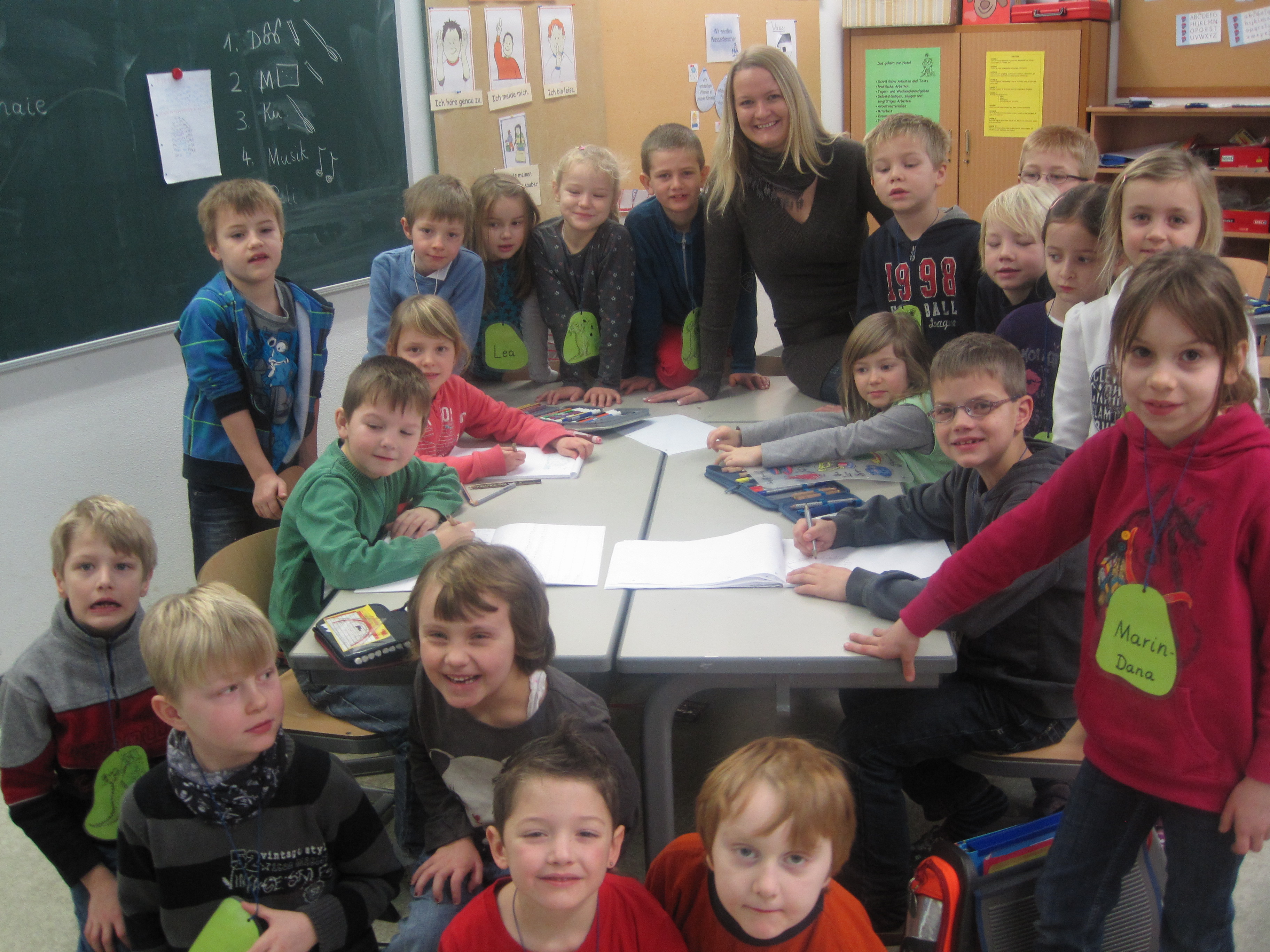Die Schulsozialarbeiterin der Stadt Lichtenau, Denise Hüllen (Vorgängerin von Diana Großblotekamp) mit der Klasse 1a der Grundschule Altenautal