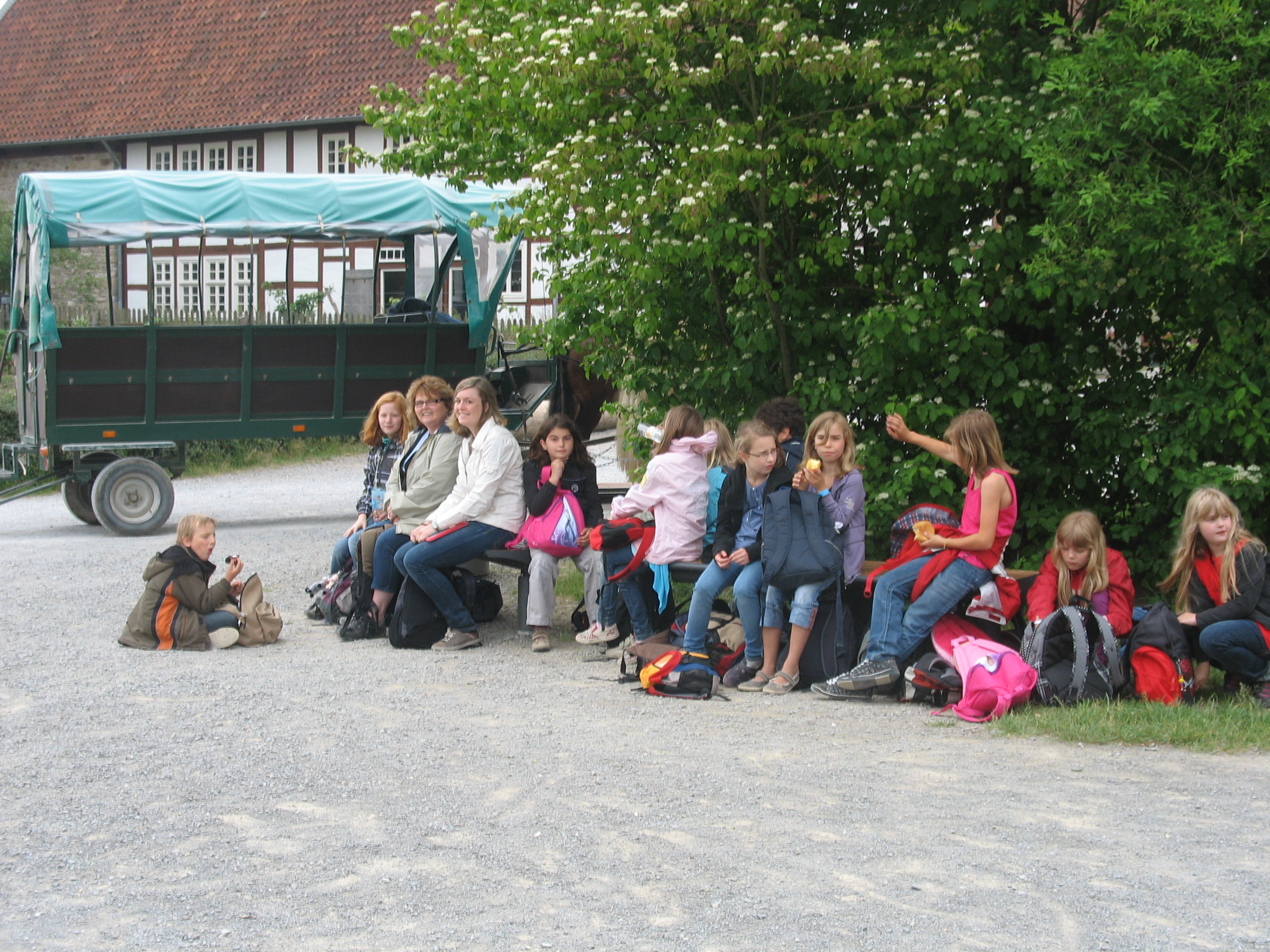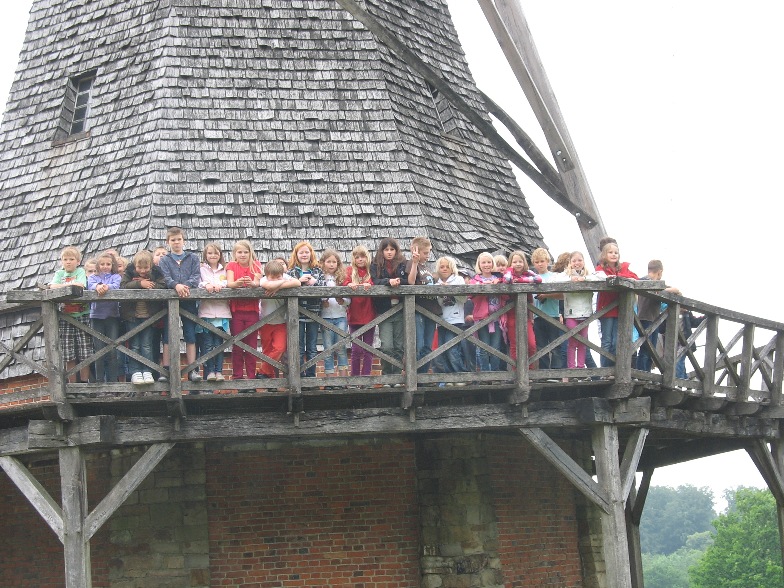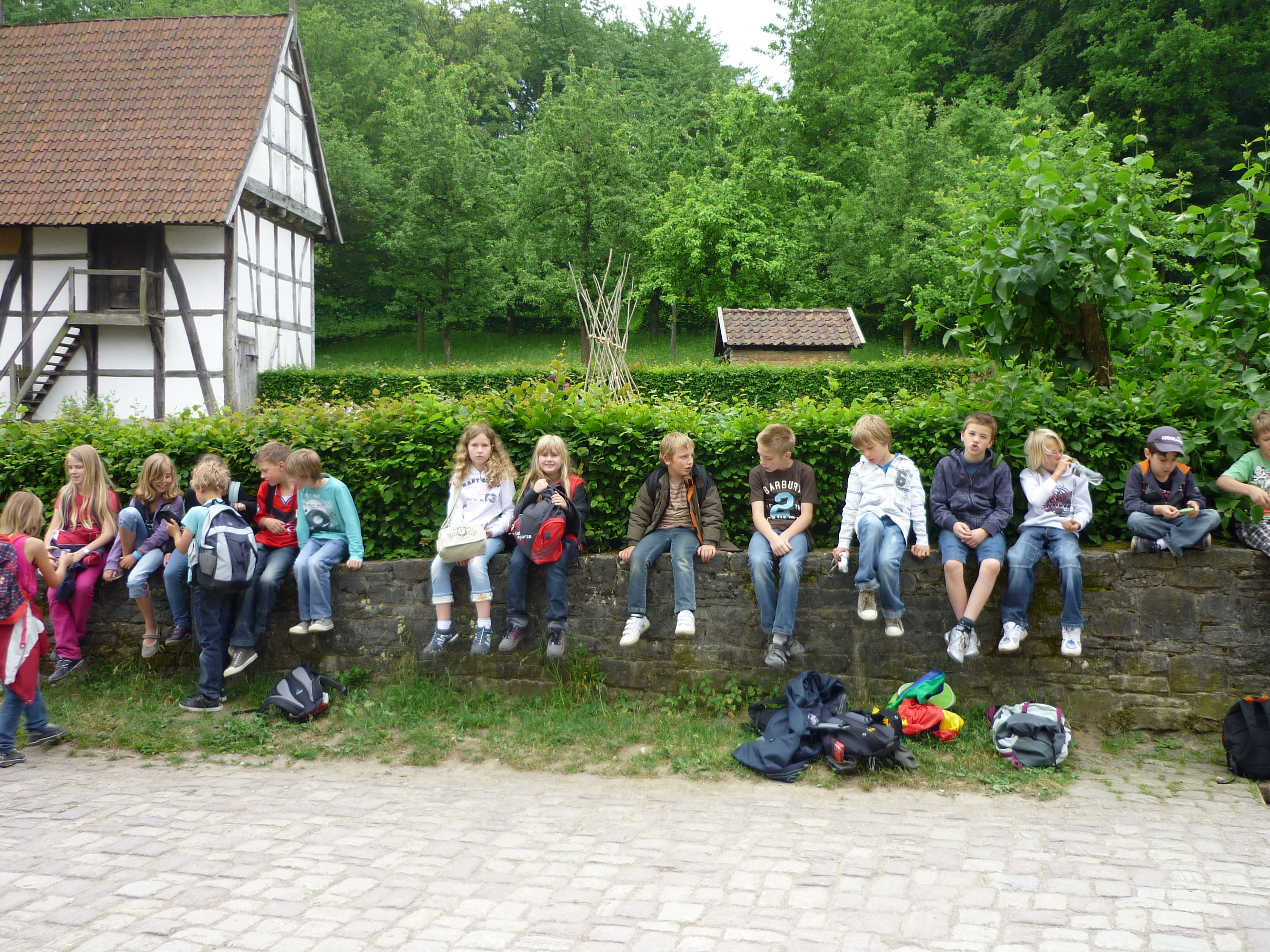 Dienstags besuchten wir erst das Freilichtmuseum. Dort besichtigten wir einige Hofanlagen, eine Wasser- und eine Windmühle und natürlich die alte Schule. Im Paderborner Dorf machten die Kinder eine Fotoralley, winzige Kleinigkeiten mussten an den lustigsten Stellen entdeckt werden. Im alten Kolonialwarenladen konnte man dann für Centbeträge Süßigkeiten kaufen. Den Weg zurück zum Eingang fuhren wir gemütlich auf zwei Planwagen, gezogen von jeweils zwei Kaltblutpferden.