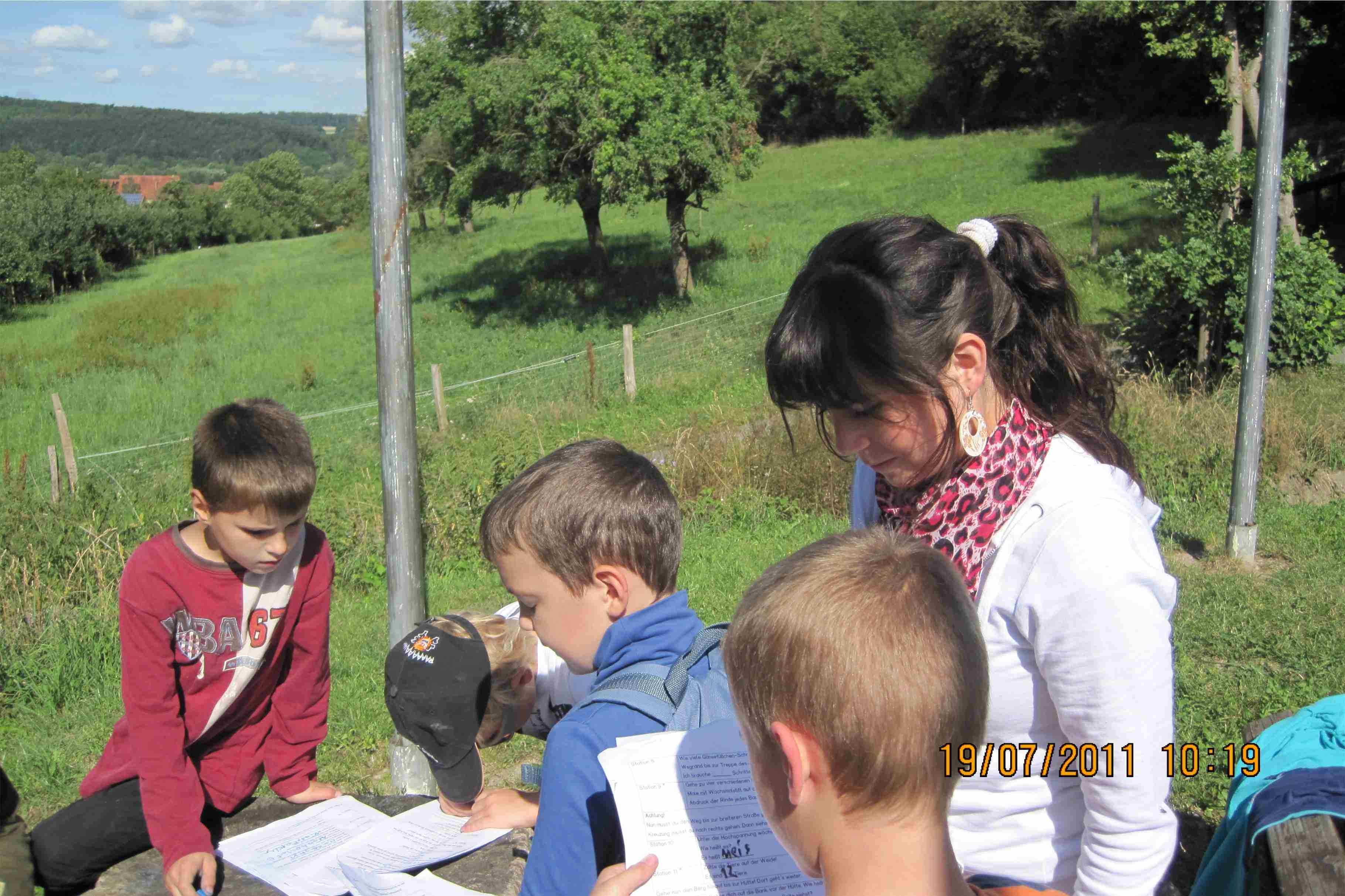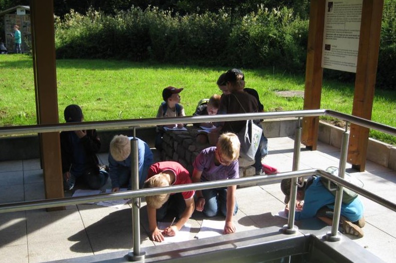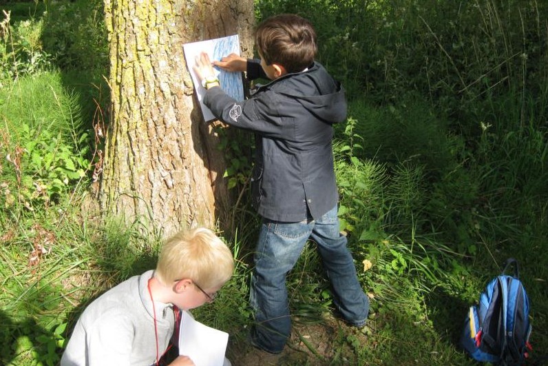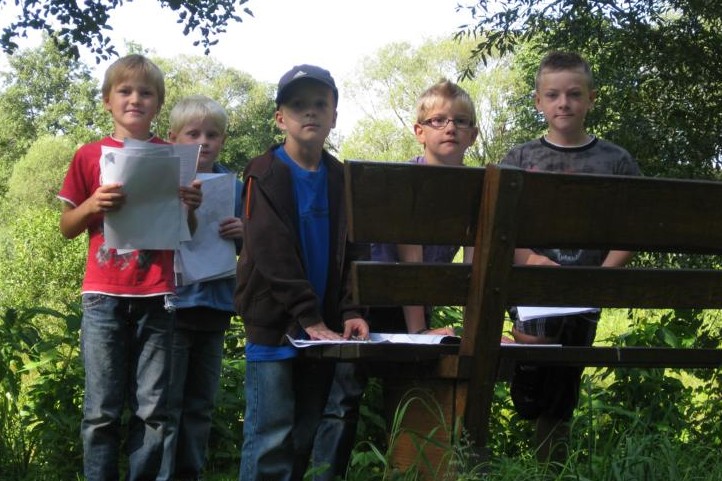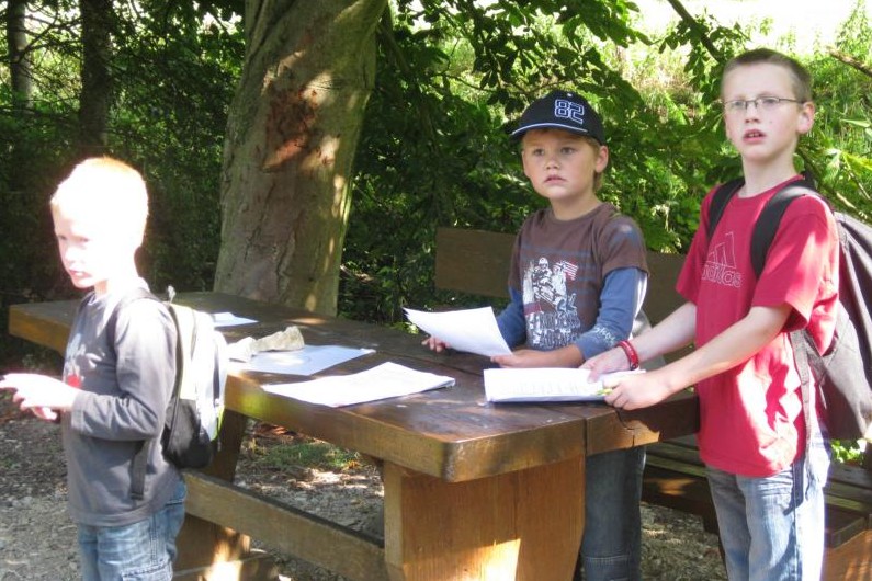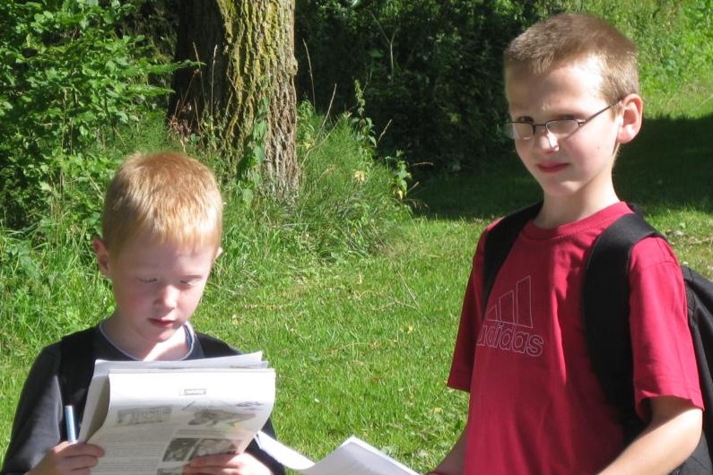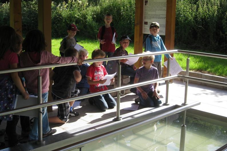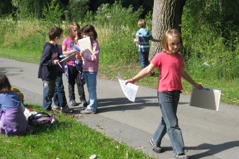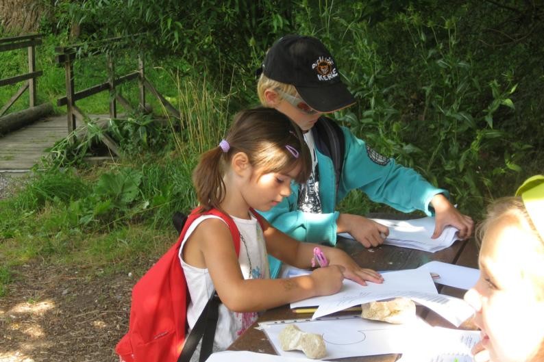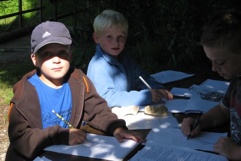 Dort teilten sie sich in kleine Gruppen auf und erkundeten mit Hilfe von Laufkarten - ausgerüstet mit Zeichenblock, Bleistift und Wachsmalstift - den Quellbereich rund um den ehemaligen Paddelteich.