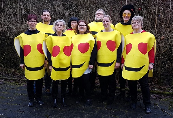 Bunt verkleidet kamen die Kinder zur Schule - Ninja, Drachen, Prinzessinnen, Punker, Hexen, Cowboys, Indianer und zwei Dosen Softdrinks. In der Schule wurden sie schon von den Lehrern erwartet, die dieses Jahr Pech bei ihrer Kostüm-Auswahl hatten. "Versehentlich" trugen sie alle das gleiche gelbe Smily-Kostüm. Die Kinder konnten sie kaum auseinanderhalten.