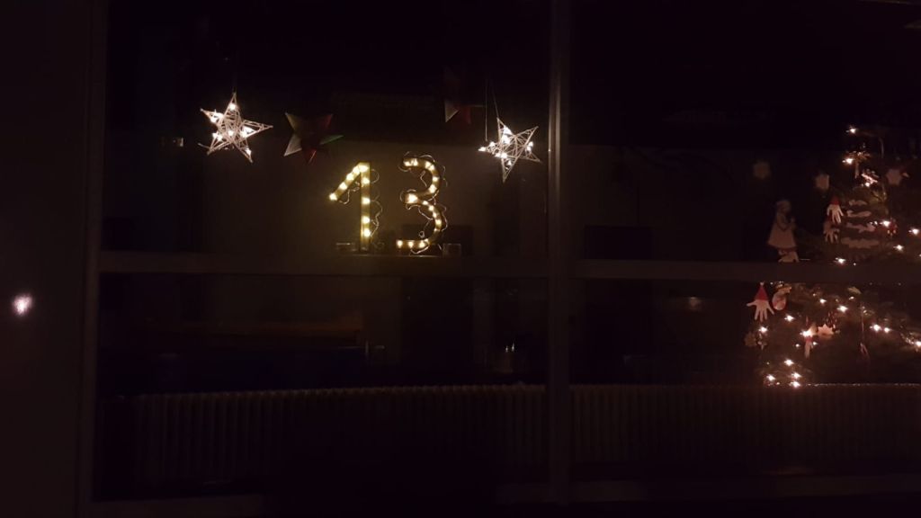 In der Adventszeit findet in Henglarn, Husen und Atteln an jedem Abend dieser "Lebendige Adventskalender" statt. Mal richten ihn Privatleute aus, mal die Kindergärten, der PGR, ... und heute die Klasse 3 unserer Schule. Passend zum Fest der heiligen Lucia war der Schulhof verdunkelt. Kerzen warfen immer wieder ihren flackernden Lichtschein über den Boden und in den Fenstern der Schule strahlten nicht nur viele selbstgebastelte Lichterketten-Sterne, sondern auch eine große "13".