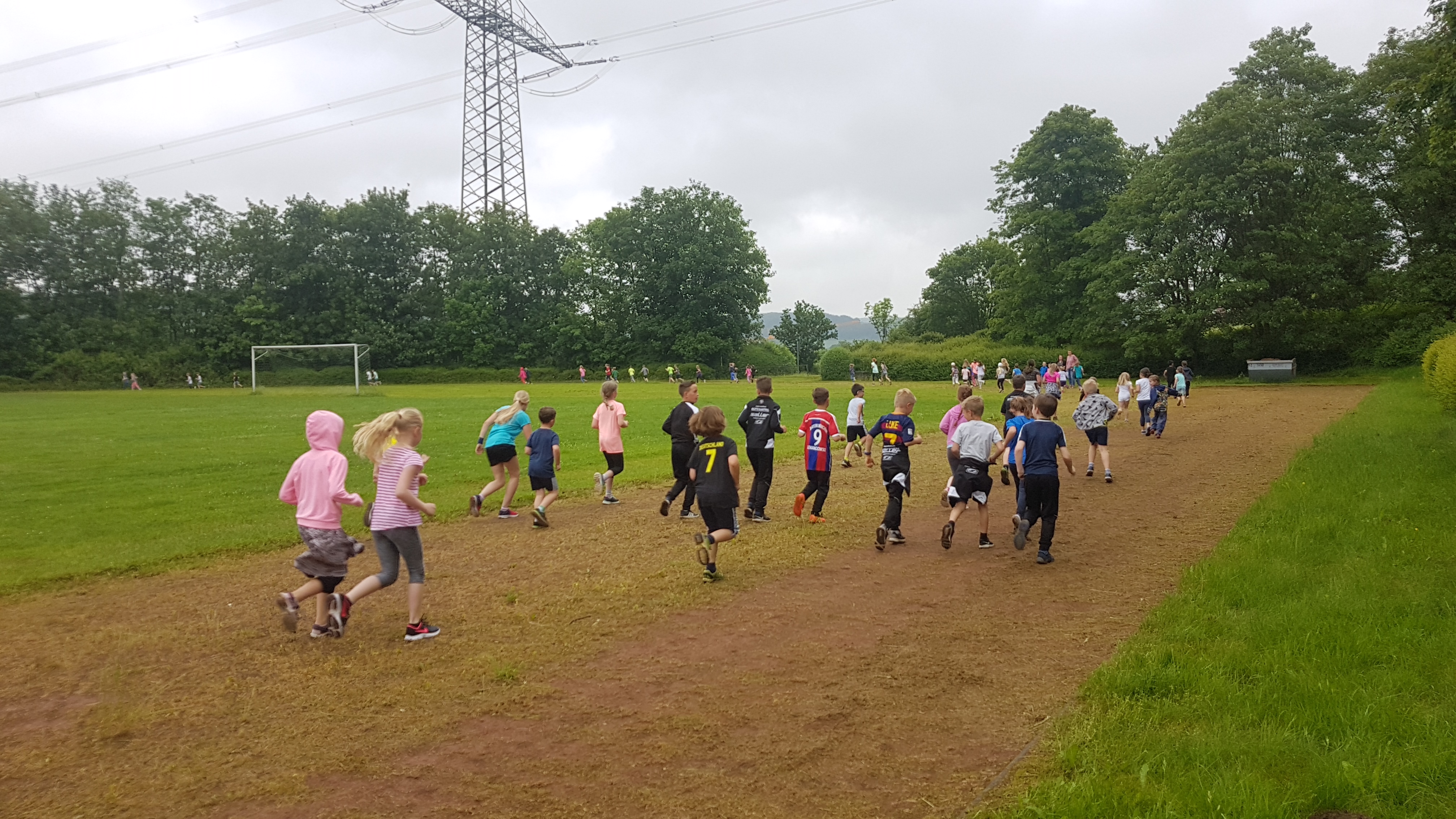 Auch wenn wir aufgrund der heutigen Wetterlage das Sportfest spontan verschoben haben (der neue Termin steht noch nicht fest) - das "Laufwunder" haben wir durchgezogen. So zogen 120 Kinder und ihre Lehrerinnen nach der Pause in Sportklamotten zum Sportplatz runter. Auf das Starsignal hin liefen sie im lockeren Trab los. 15 Minuten immer um den Sportplatz war das Ziel. Der Timer lief. Wer nicht mehr konnte, meldete sich bei einem der Streckenposten, wo die Zeit des Kindes notiert wurde.