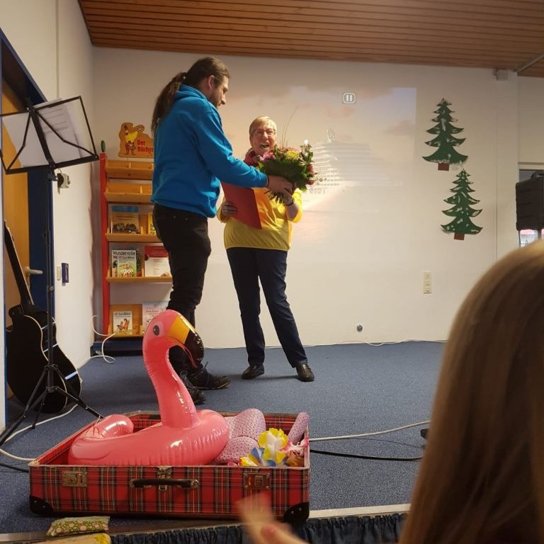 Auch der offizielle Teil fand auf der Bühne statt: zusammen mit einem Blumenstrauß überreichte Herr Kremer seiner scheidenden Kollegin die Urkunde zur Versetzung in den Ruhestand.