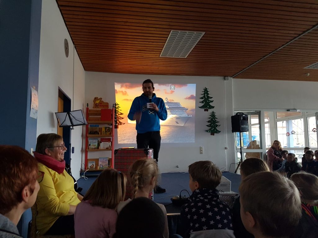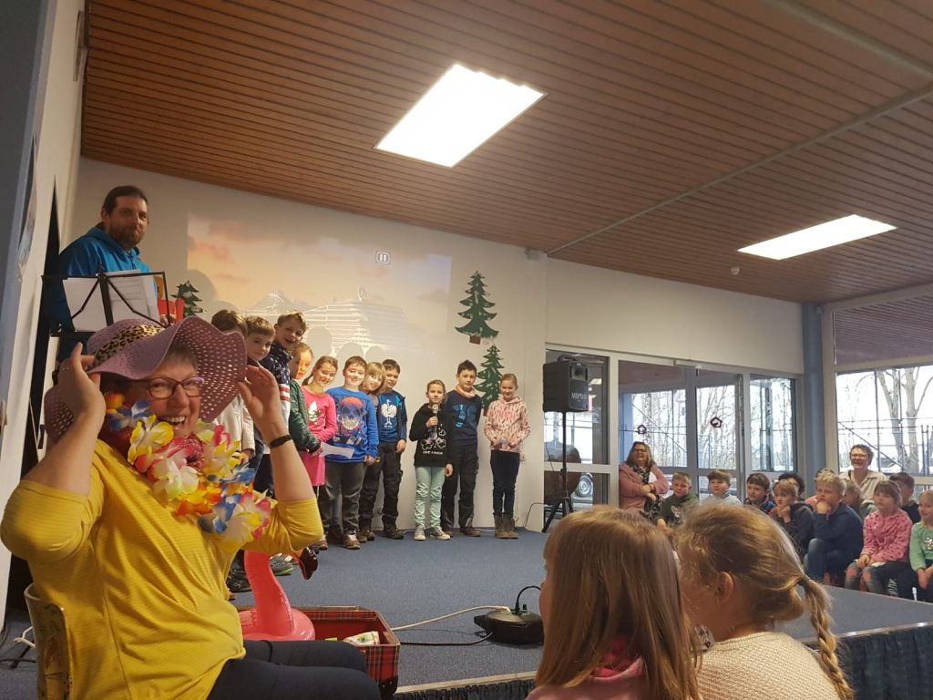 Nach der kurzen Einleitung trugen die Lehrer eine umgedichtete Version von "Ich war noch niemals in New York" vor. Ab jetzt war Zeit zum Reisen. Die Planung von Frau Schuhmacher, öfters zu verreisen, spiegelte sich auch in den Wünschen der Kinder wieder, die sie anschließend für ihre Noch-Lehrerin hatten.