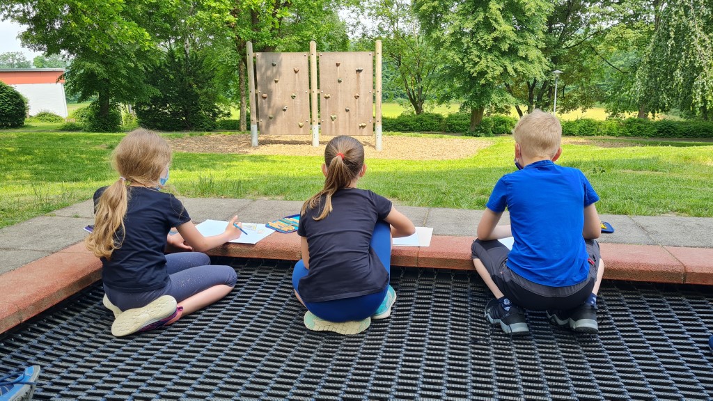 Während die Klasse 4a auf dem Schulhof tanzt, nutzt die Klasse 4b die Zeit und das gute Wetter und macht Skizzen und Bilder von unserer Schule.