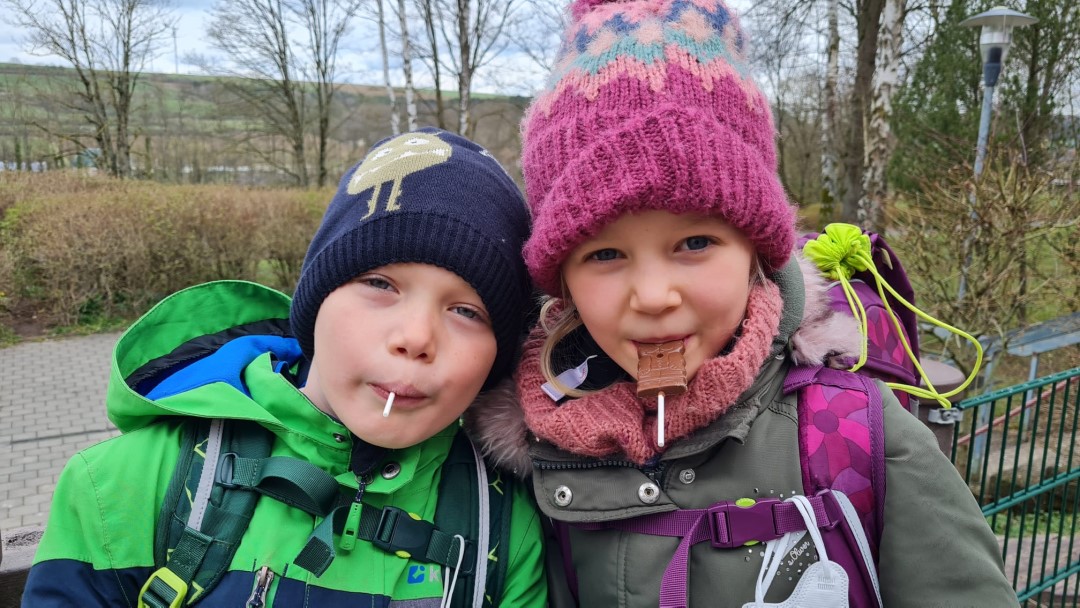 So können sich alle Kinder zur Belohnung für die letzten, langen Wochen in der Schule den Schokololli schmecken lassen. Wochen, die von Unterricht, Lolli-Tests, Quarantäne, Masken, Lüften, Abstand aber auch viel Spaß und Zusammenleben und -Lernen geprägt waren. Immerhin: wir waren die letzten 12 Wochen in der Schule - im Gegensatz zu den beiden Vorjahren. Auch darauf kann man mit dem Schoko-Lolli anstoßen, denn so muss es sein.