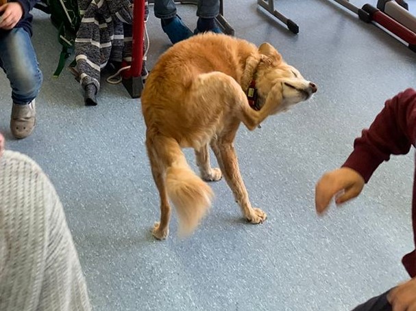 Die Klasse 2b hatte auch Besuch. Max, der Mischlingshund von Frau Schäfers, besuchte die Klasse. In den letzten Wochen ging es im Unterricht um Haustiere. Da war es klar, dass der Hund auch einmal dabei sein durfte. Mit seinen Spitzen Yoda-Ohren und sein sympathisches Hundeauftreten begeisterte er die Klasse auf Anhieb. Er darf gerne auch mal wieder zu Besuch kommen.