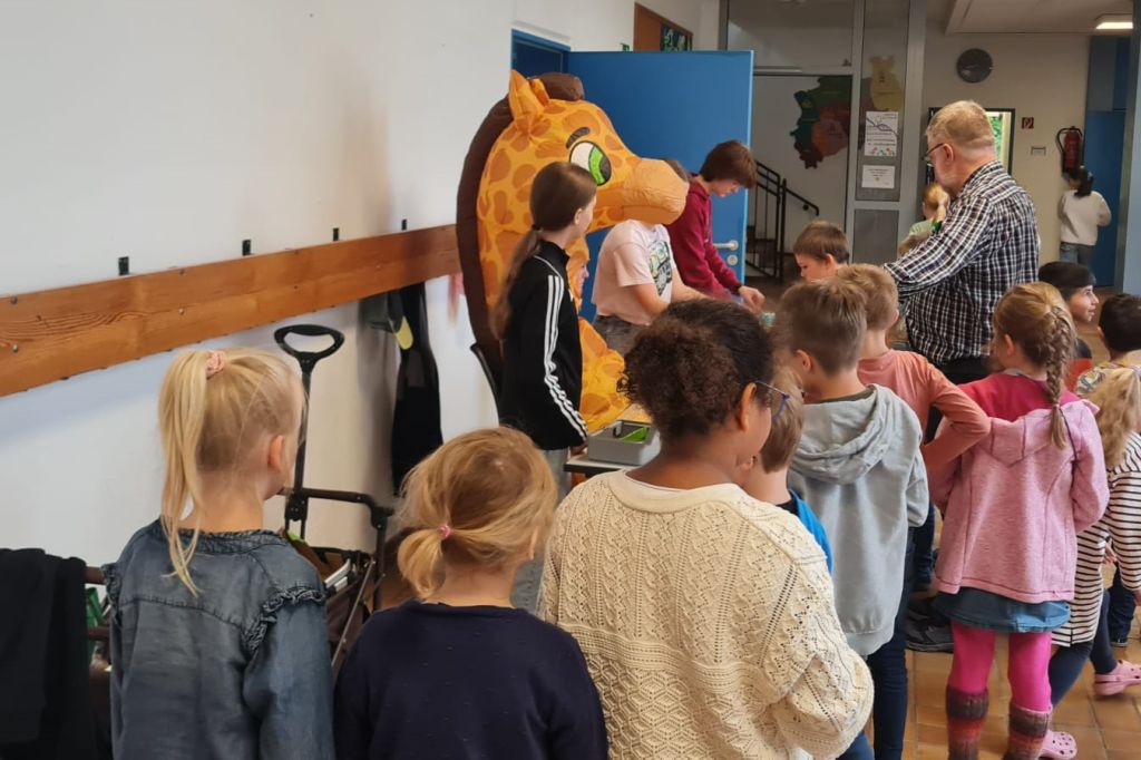 Dass der Kuchenverkauf standfand, wussten die Kinder auch schon vorher. Aber etwas verwundert waren sie doch, als sie während der 1. Stunde aus dem Fenster schauten und plötzlich riefen "Da ist eine Giraffe!"