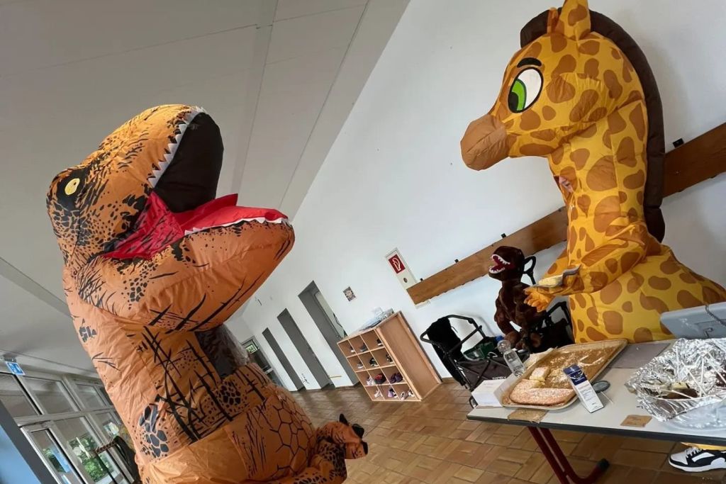 Ab der 2. Stunde standen die Schülerinnen und Schüler unserer Schule am Verkaufsstand an, während ihnen der Waffelduft in die Nase trieb. Aber der Duft lockte auch unseren Haus-Dino aus seinem Versteck im Heizungskeller und in einem unbeobachteten Moment stellte auch er sich beim Waffelstand an. Es hat ihm sicherlich auch geschmeckt. Genau wie den Kindern.