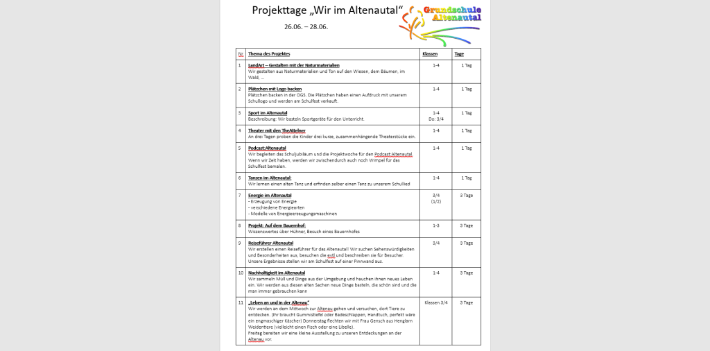Die Kinder konnten aus verschiedenen eintägigen oder dreitägigen Projekten auswählen. Wir wünschen allen Kindern viel Spaß bei den gewählten Projekten.